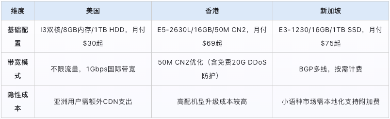 核心差异体现在网络延迟、带宽成本、数据合规性及目标市场覆盖上。美国服务器适合欧美用户,硬件成本低且扩展性强;香港服务器凭借CN2优化线ms),但价格较高;新加坡则在东南亚访问速度与性价比间取得平衡