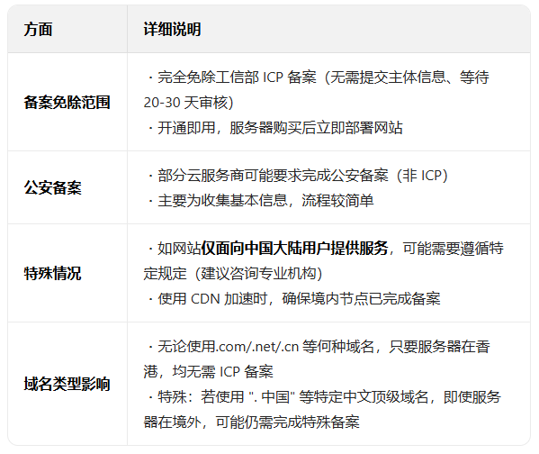 香港服务器搭建的网站域名不需要进行中国大陆 ICP 备案,这是香港作为特别行政区的政策优势之一。无论您的域名在何处注册,只要服务器位于香港,即可直接部署网站,无需履行备案手续。