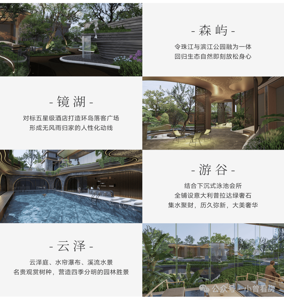 蓝调国际大师主笔,“溯源”广州在地文化,以珠江为源头,溯流而上,从外到内匠心打造:森屿、镜湖、游谷、云泽“四重景观礼序”,塑造优雅归家动线。