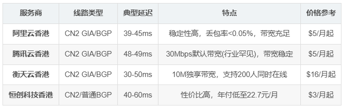 最佳服务商:阿里云香港 (39-45ms)、腾讯云香港 (48-49ms)、恒创科技 (35ms,广东地区)