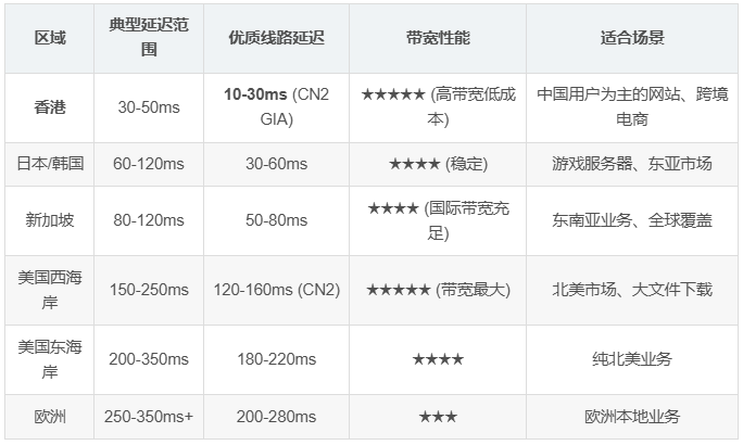 实测数据:广州→香港 (CN2) 仅 12ms,而广州→新加坡 86ms,差距达 7 倍;北京→阿里云香港 39ms,而北京→美国西海岸 (CN2) 约 130-150ms。