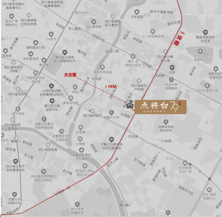 成都卓越·点将台79项目地块位于成都一环内锦江区,临近牛王庙、点将台等成都历史事件坐标。项目地理位置优越,商业繁茂,其所在的东大街片区是成都最繁盛的商贸中心之一,孕育出了太古里、春熙路等现代商业中心。