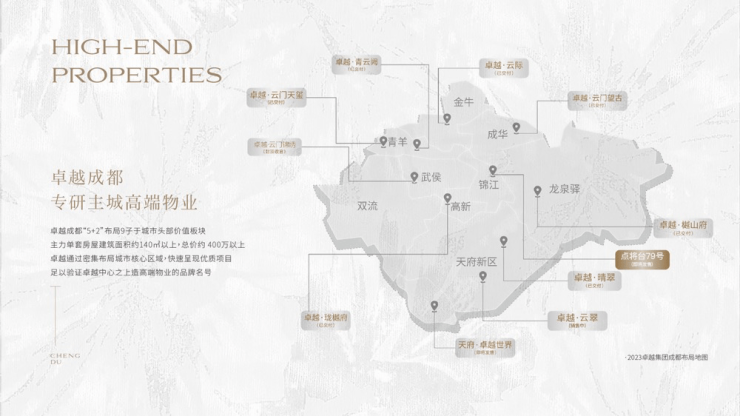 5+2核心城区,选址均在城市头部价值板块,主力单套房屋建筑面积约140㎡以上,总价约400万以上。卓越通过密集布局城市核心区域,快速呈现优质项目,足以验证卓越中心之上造高端物业的品牌名号。