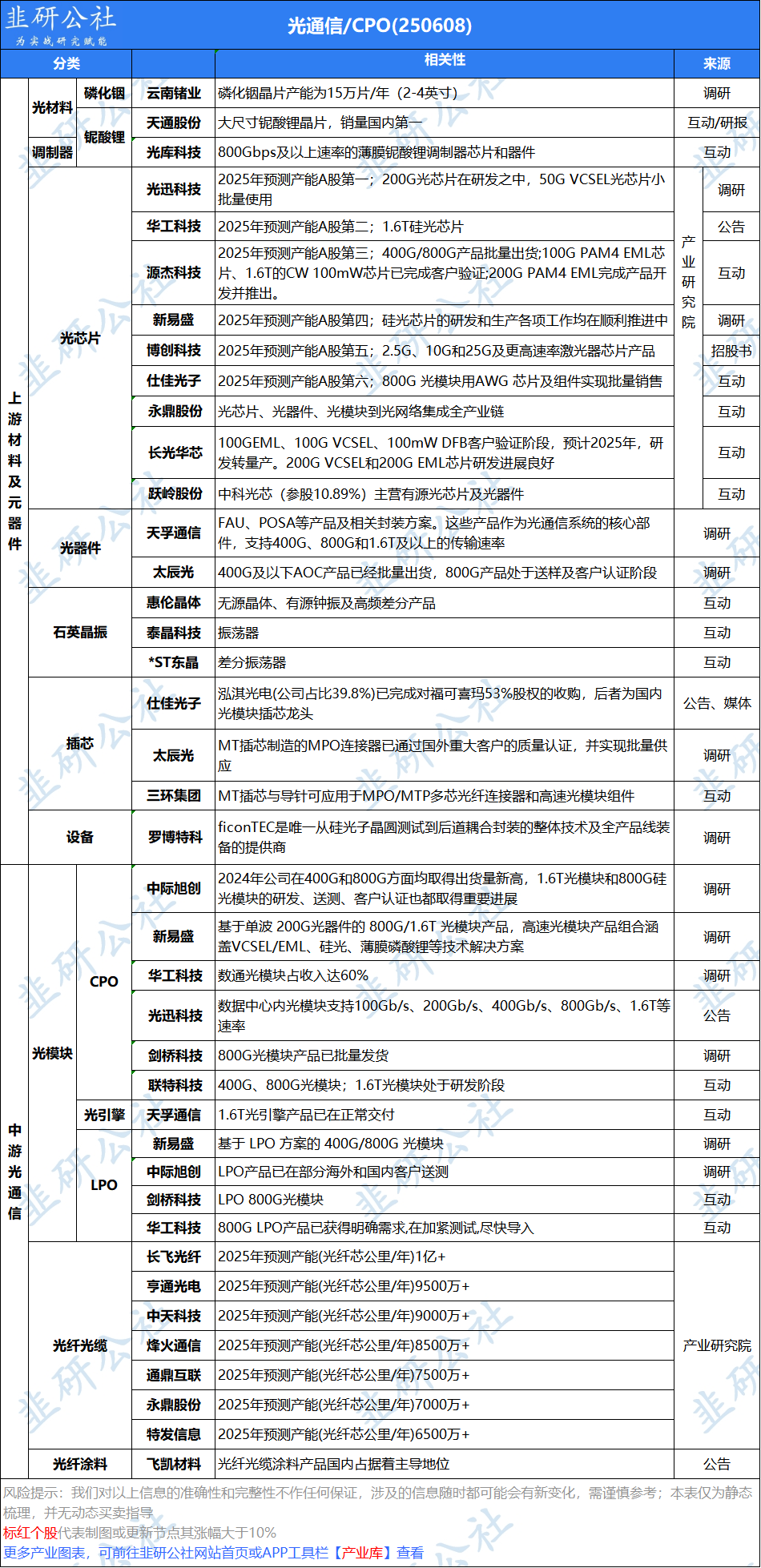 光迅科技(002281):唯一实现10G-1.6T全系列光芯片量产的国企,2025年自供率提升至30%。硅光芯片良率突破80%,CPO方案已送样英伟达。
