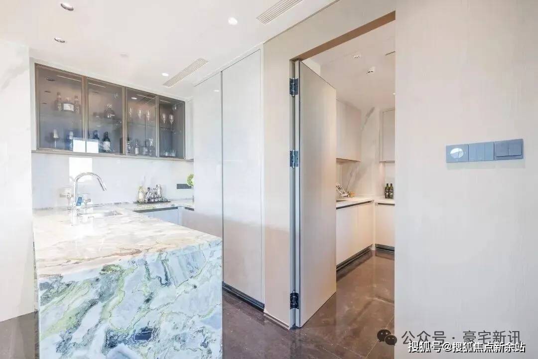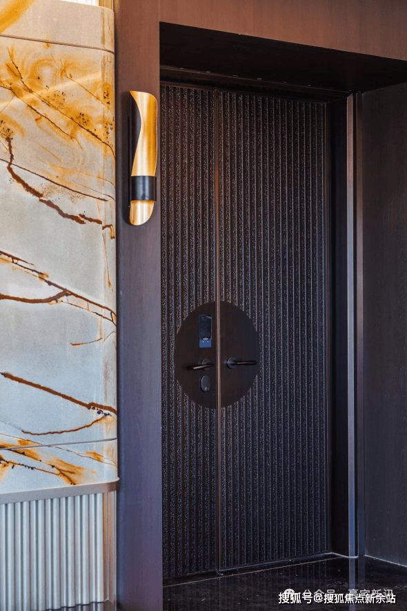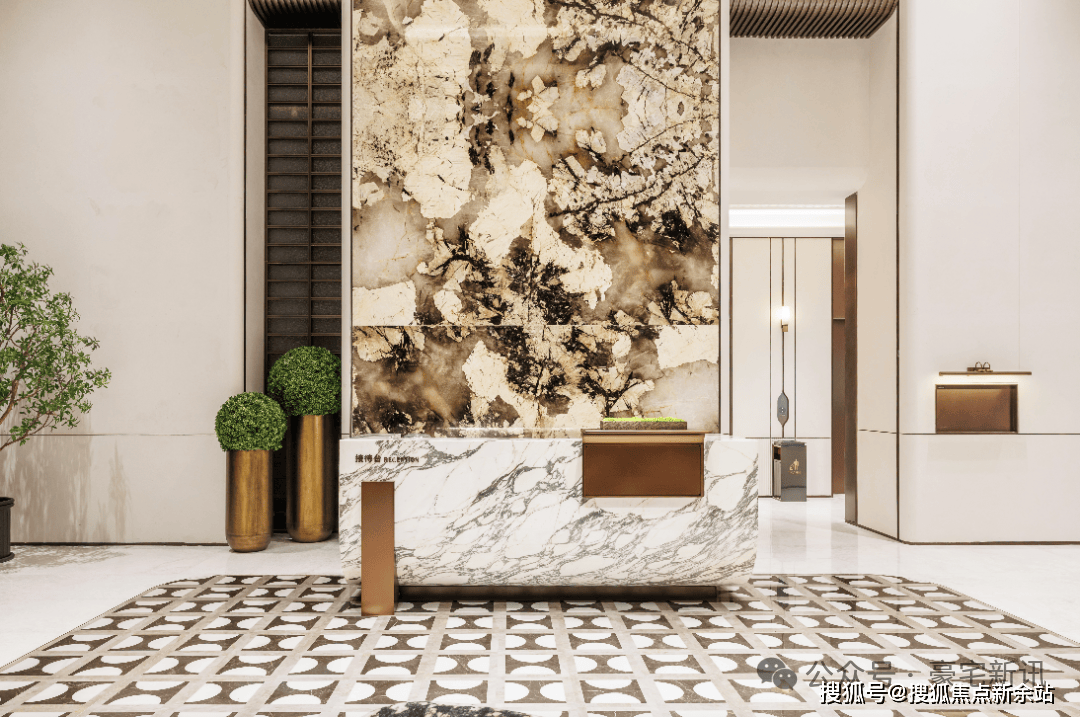 进入入户大堂,奢石的运用更是达到艺术化与功能性的共生。约3.5米宽、7.9米高的潘多拉奢石背景墙,石材天然的棕白纹理如飞龙盘旋而上,色彩随光影流动,赋予静态石材动态艺术感。