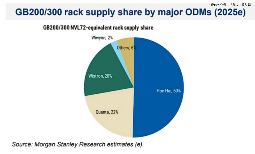 从2025年度GB200、GB300机架服务器各ODM厂出货的市场占比来看,鸿海占过半的市场份额,高达52%;纬创约占21%;广达占约 19%;就产品别来看,GB200占比高达81%,GB300则约 19%。