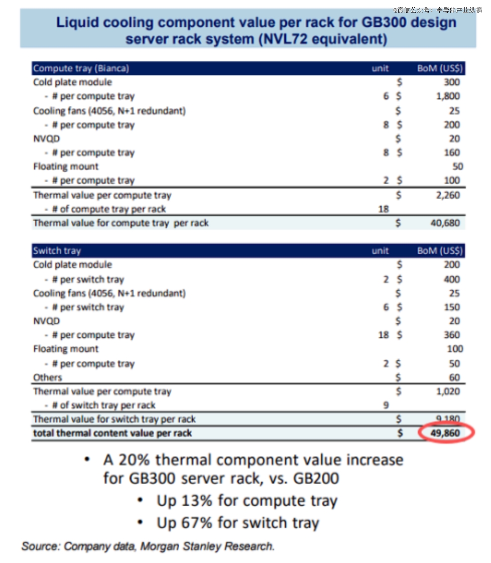 具体来看,英伟达GB300 NVL72机架级AI系统,单单是液冷散热组件的价值就高达49860美元(约合人民币近36万元),这已经比GB200 NVL72系统高了大约20%。
