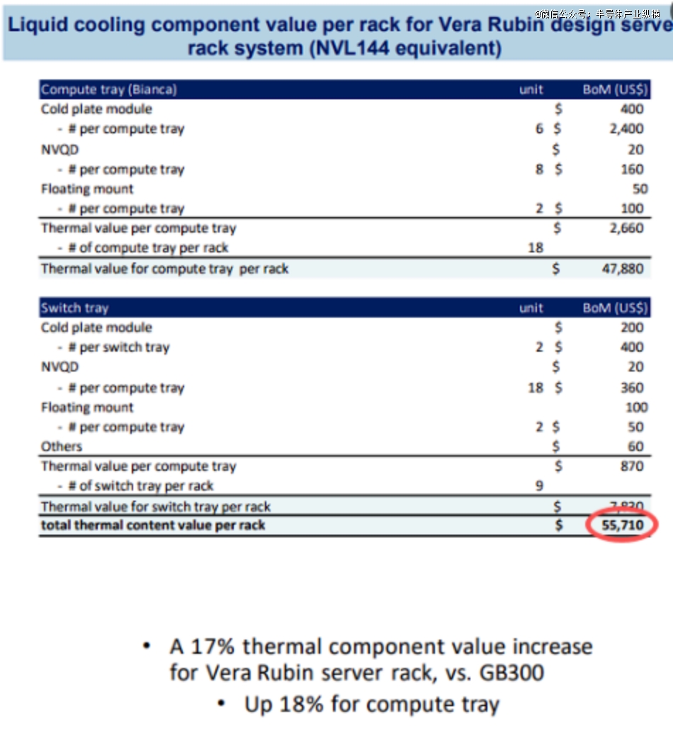 有数据表明,下一代Vera Rubin NVL144平台的散热总价将更高。随着计算托架和交换机托架的冷却需求进一步增加,预计每个机柜的冷却组件总价值将增长17%,达到约55710美元(约合人民币近40万元),其中为交换机托架设计的冷却模块预计价值将显著增长67%。