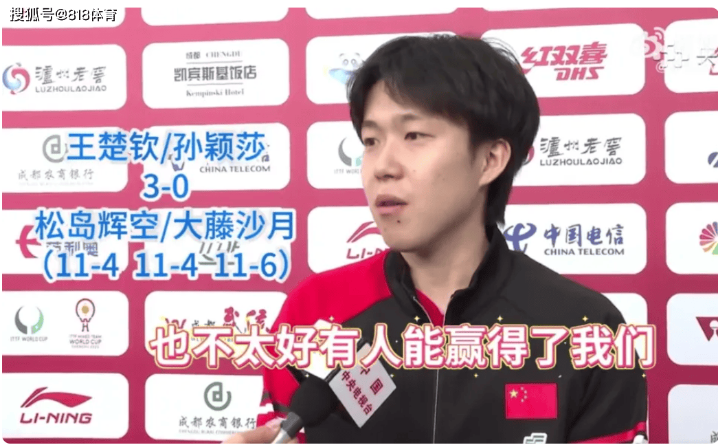 首场混双比赛,王楚钦/孙颖莎3-0战胜松岛辉空/大藤沙月,赛后采访时,王楚钦霸气表示:“但是作为我们来说,肯定是坚定我们自己,我相信只要我们两个平稳发挥正常,包括全力调动,这个世界上也不太好有人能赢得了我们!我认为在这场决赛当中,不论是我还是孙颖莎,发挥都非常出色,整场比赛没有给对手太多的机会和空间,整个技战术的布置和对对手的这种准备,一切都做得非常充分!包括后面的队友也非常给力。”