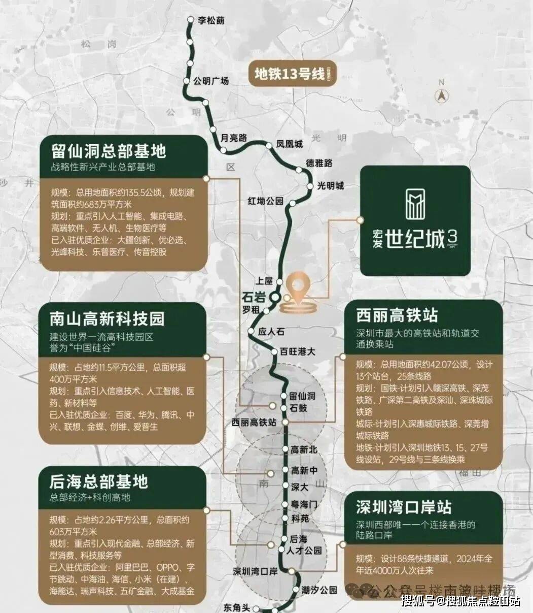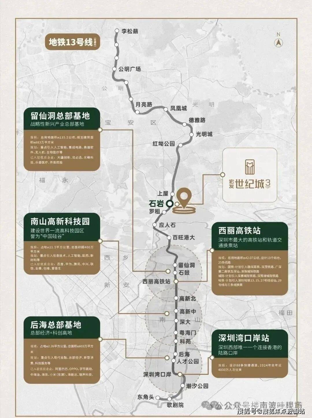 地铁13号线站科技园;由南至北串联后海总部基地、南山高新科技园、西丽留仙洞总部基地,聚集大量高科技与金融企业,吸引科技及金融人才;通达深圳湾口岸站,畅连香港;同时6站直达深圳最大的高铁站和轨道交通换乘站——西丽高铁站(在建中),畅达全国。