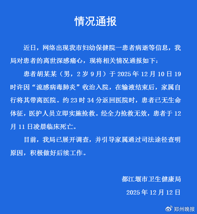 2岁男童输液后死亡,12月12日,四川都江堰卫健局通报:患儿因“流感病毒肺炎”入院,输液结束后,家属自行带离医院,再返回时患者已无生命体征。该局已展开调查,引导家属通过司法途径查明原因。