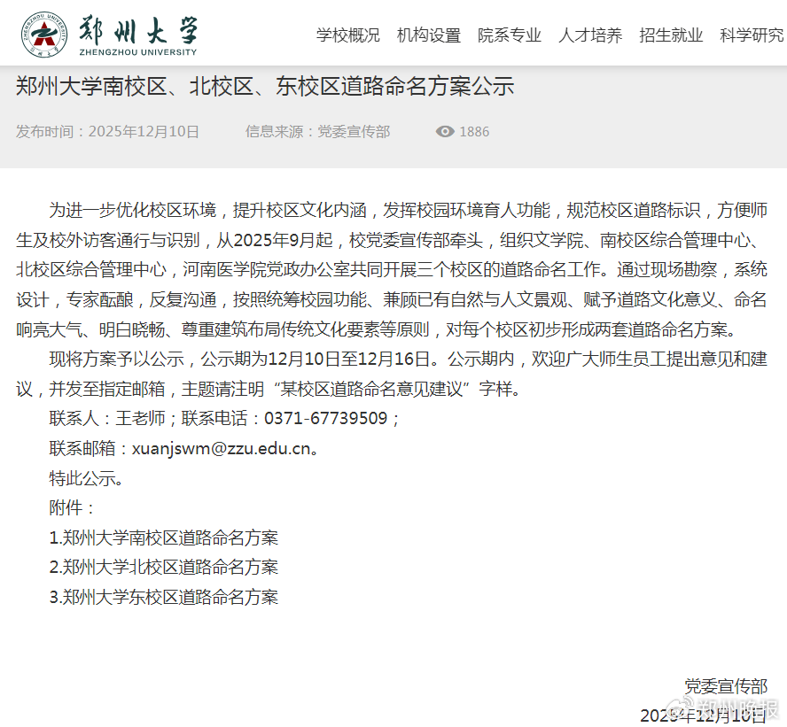 郑州大学公示南校区、北校区、东校区道路命名方案,公示期至12月16日,师生可提意见建议。每个校区均推出两套方案,方案多兼顾校园功能、人文景观与传统文化,融入治学理念、历史纪念等内涵,旨在优化校区环境、提升文化内涵、规范道路标识,方便通行识别。