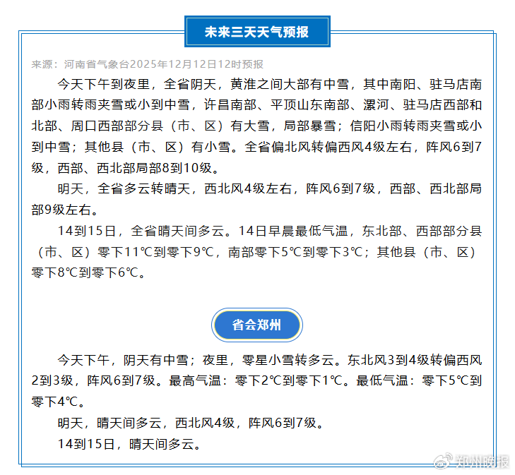 河南省气象台2025年12月12日17时继续发布道路结冰黄色预警:今天白天,我省北中部出现小到中雪,局部大雪,预计今天夜里中东部、南部有小到中雪,南部高海拔山区有中到大雪。全省大部夜间路表温度低于0℃,将出现对交通有较大影响的道路结冰,其中安阳西北部、新乡中西部、焦作、济源、三门峡、洛阳、郑州西部和东部、开封西部、平顶山北部、许昌将出现对交通有较严重影响的道路结冰。请注意防范。上述地区的相邻县(市、区)也需关注。