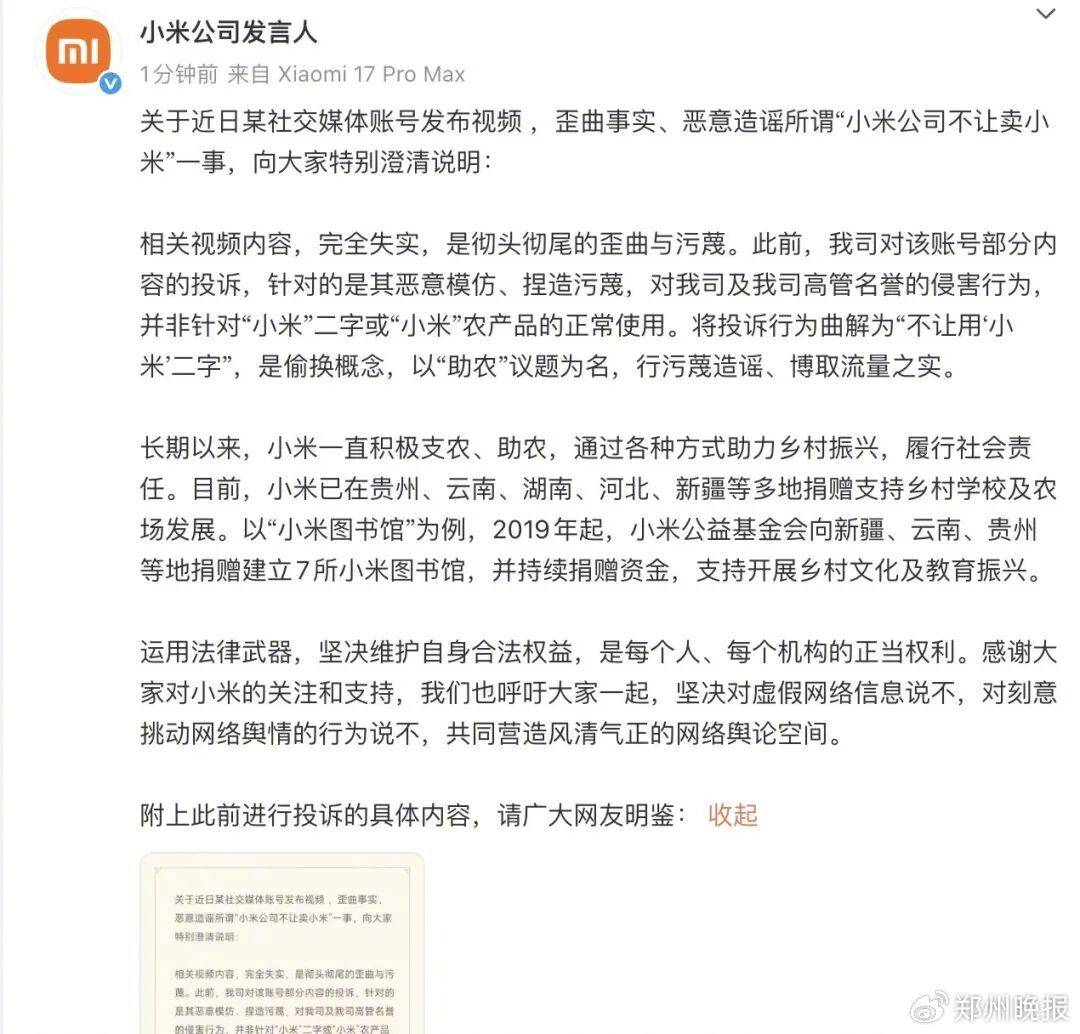12月12日,小米公司回应“村支书卖农产品小米被投诉下架”:完全失实,投诉针对其恶意模仿、捏造污蔑,侵害我司及高管名誉行为。当事人道歉:今后一定会规范自己的网络言行。