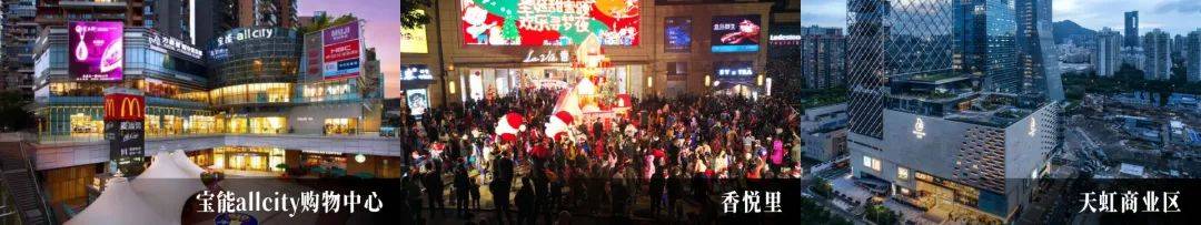 从项目所在地驱车5分钟,即可直达占地11万平方米的宝能Allcity购物中心。这座规模宏大的商业综合体,集购物、餐饮、休闲、娱乐等多元业态于一体,已然成为区域内极具影响力的商业地标。其地理位置尤为优越,与香悦里、天虹商业区形成“黄金三角”——三者直线公里以内,共同构筑起高密度、强辐射的核心商业圈。消费者在此1公里半径内,可一站式满足时尚购物、特色餐饮、休闲娱乐及生活服务等全方位需求,畅享便捷多元的消费体验。