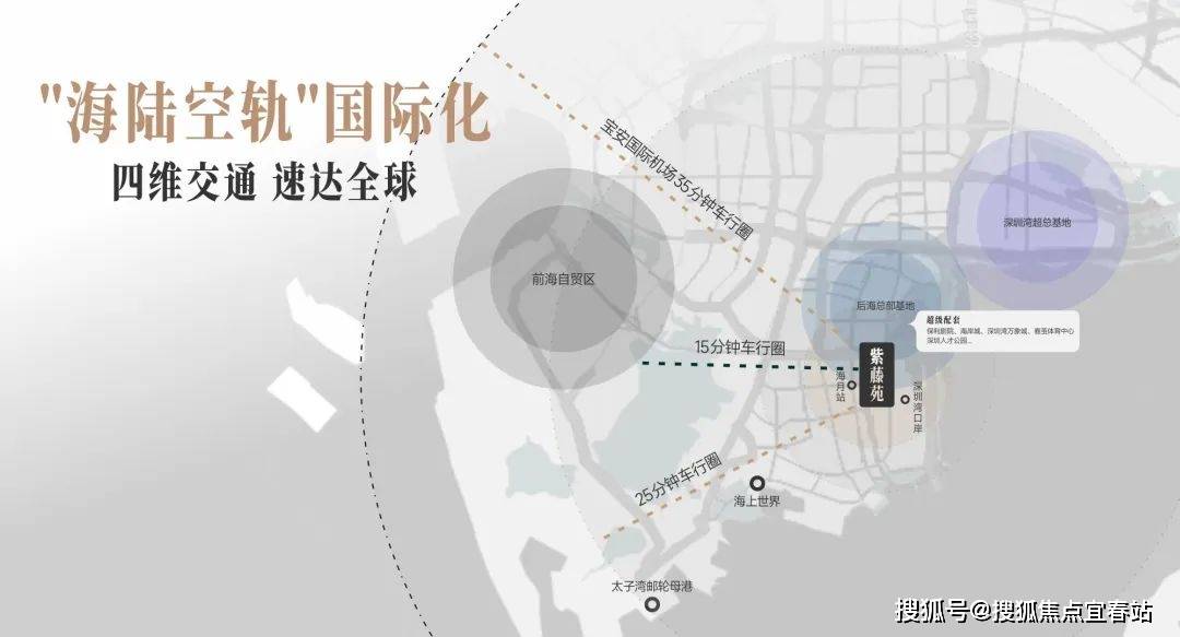 本项目地理位置优越,拥有海陆空轨四位一体国际化交通网络,能快速通达全球。距地铁2号线米,片区三纵四横路网,距深圳湾口岸约200米,与香港无缝连接。从项目出发,25分钟可达香港中环及香港国际机场,经沿江高速可快速抵达广州及珠三角其他地区。