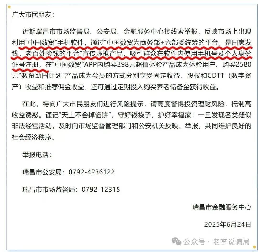 2025年12月10日,济南市槐荫区金融稳定发展领导小组办公室发布关于“中国数贸”APP投资理财存在风险隐患的提示。