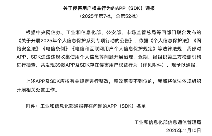 工信微报披露,工业和信息化部近期对APP、SDK违法违规收集使用个人信息等问题开展治理。经组织第三方检测机构进行抽查,共发现39款APP及SDK存在侵害用户权益行为,其中不乏唱吧等知名软件。此次唱吧被通报的主要问题在于违规收集个人信息,抽检软件来源于小鹏车载应用商店。工信部通报的问题中还包括强制用户使用定向推送功能、未明示收集个人信息清单、强制自动续费、超范围收集个人信息等。
