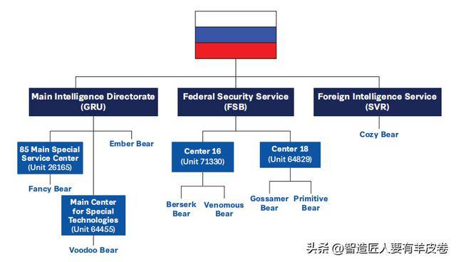 俄罗斯在网络领域既依靠国家情报/安全机构开展工作,也动用一些民间网络力量。在政府体系中,没有任何一个专门的俄罗斯安全或情报机构对网络作战负有完全责任。观察人士指出,俄罗斯各网络单位之间的协调很弱。这种体制“导致各机构在资源、人员和影响力上相互竞争”,也有时导致其在毫不知情的情况下各自开展类似行动。俄罗斯总参情报总局、联邦安全局和联邦对外情报局内部都设有实力强劲的进攻型网络单位,通常是高级持续性威胁组织,只是其作战手法和技术水平有所差异。下文将对这三大俄罗斯网络相关机构进行介绍。