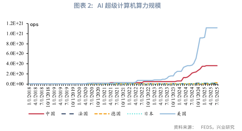 在超级计算机方面,当前美国拥有的超级计算机算力规模显著领先,截至2025年7月美国拥有112万PFLOPS超算算力,我国的超算算力为35.9万PFLOPS。假设我国超算算力要达到美国当前的水平,需要增加76.1万PFLOPS。从超算中心的投资金额来看,鄂尔多斯超算中心[9]、文昌航天超算中心[10]、武汉超算中心[11]的投资金额分别为10亿、12亿、9.5亿元,建成后算力分别为350、200、100P FLOPS。平均来看,建设每100PFLOPS超算算力需投资3.8亿元,增加76.1万PFLOPS超算算力所需的投资为2.9万亿元。