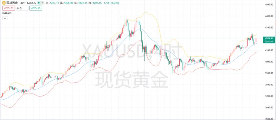 回到黄金四小时图,呈现强势多头基础,布林带向上开口,阻力位4238美元/盎司为当日布林带上轨位置,是日内首要阻力点,金价多次试探该位置但暂未有效突破,该价位对多头进攻形成明显压制;支撑位4180美元/盎司作为近期行情中的关键整数关口,同时是前期上涨过程中的重要整理区间,具有较强的技术支撑意义,是日内回调的首要防守位。今日操作上建议回调至4180美元附近做多,防守10个点,目标看4230-4240美元。