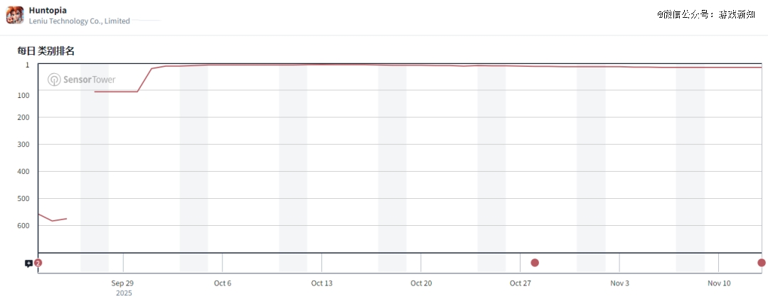 今年9月,广州乐牛旗下《Huntopia》在全球发布,很快便跻身美国Google Play游戏畅销榜TOP100,此后长期保持在RPG品类畅销榜前20名。