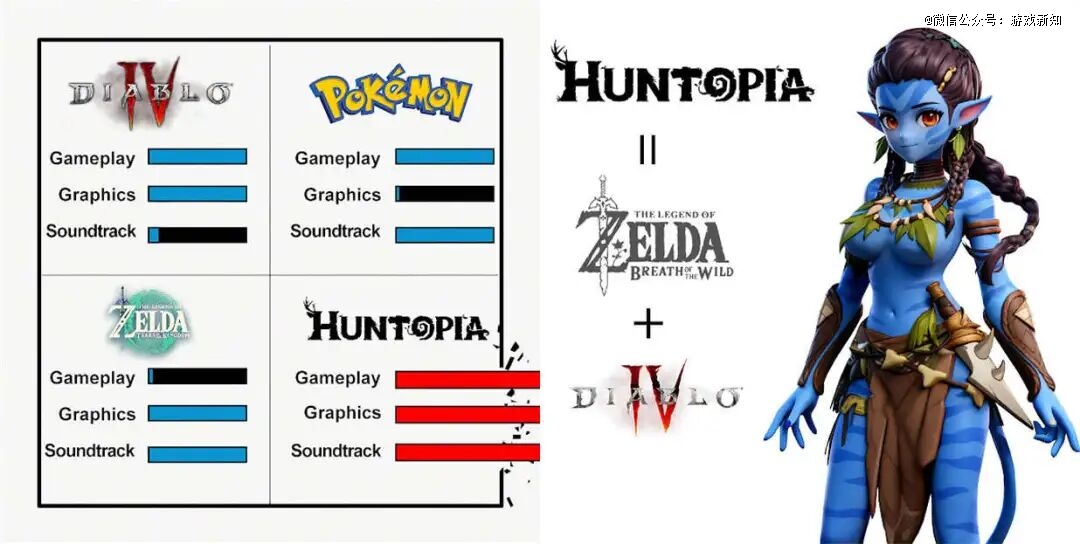 例如,有的素材会拎出另外三款游戏,从玩法、画面及音乐等维度与《Huntopia》展开对比,进而营造《Huntopia》各项表现爆表的假象;有的素材会展示带有阿凡达、原始人(barbarian)要素的角色,有的素材还会从场景到构图让人幻视《魔兽世界》;甚至有些素材使用了诸如「无尽AFK」「堪比《原神》」「DIABLO+ZELDA=HUNTOPIA」的关键词进行宣传。