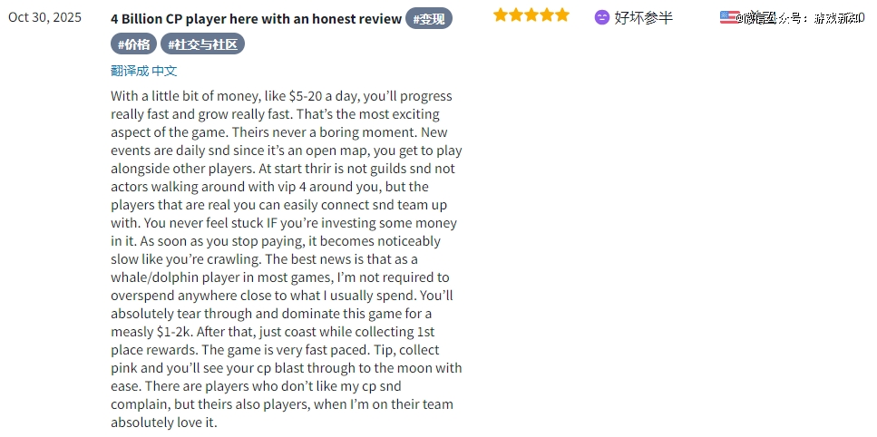 从评论区可以看到,部分付费用户对此感到满意,认为升级曲线设计相对合理,无需巨额投入即可冲击排行榜首位。有大R表示,《Huntopia》不像他平时玩的游戏那样需要投入很多钱,只需要投入1000~2000美元就能轻松碾压对手、称霸服务器。