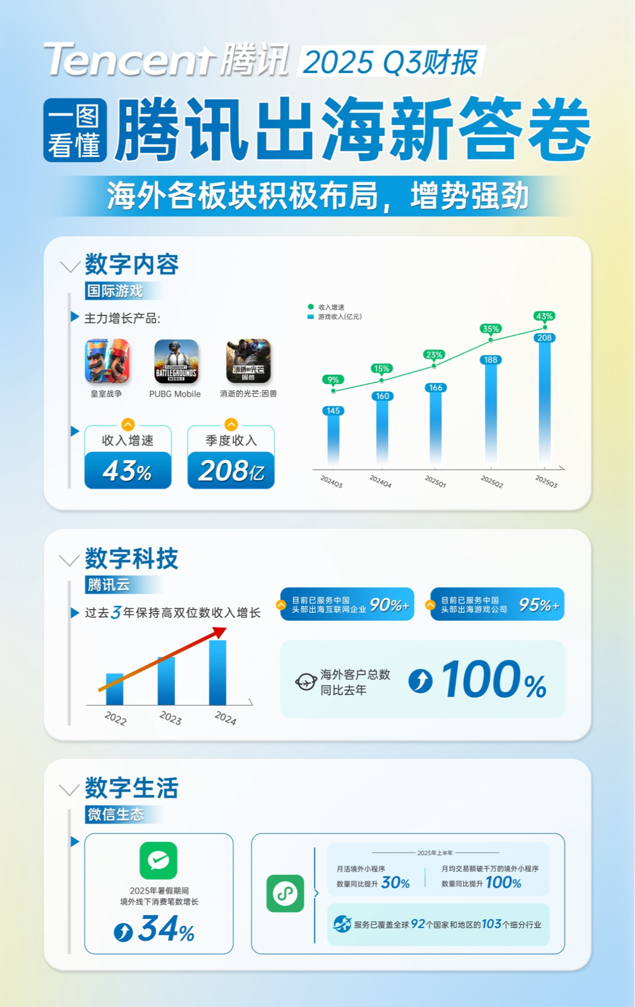 在鼓励产业出海的政策背景下,腾讯积极拓展国际市场,并取得突破性进展。本季度,公司海外收入增长主要由游戏业务强劲表现驱动,云服务与微信生态亦取得扎实进展。