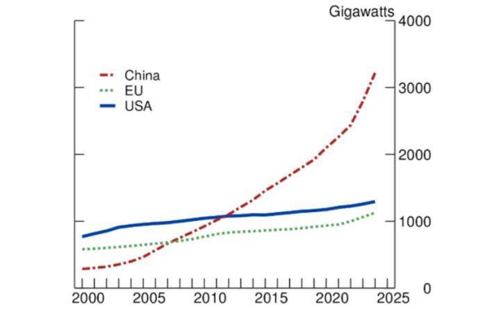 不过在能源基础设施上,中国更具优势。数据中心带来了电力需求大幅增长。十多年前,中国的发电容量超过了美国,装机容量约为3200吉瓦,而美国为1293吉瓦,欧盟为1125吉瓦。仅2024年,中国就增加了429吉瓦的净发电容量,是美国净新增容量的15倍多。国际能源署预计,到2030年,全球数据中心的电力消耗将增加一倍以上,其中美国和中国占增长的80%。