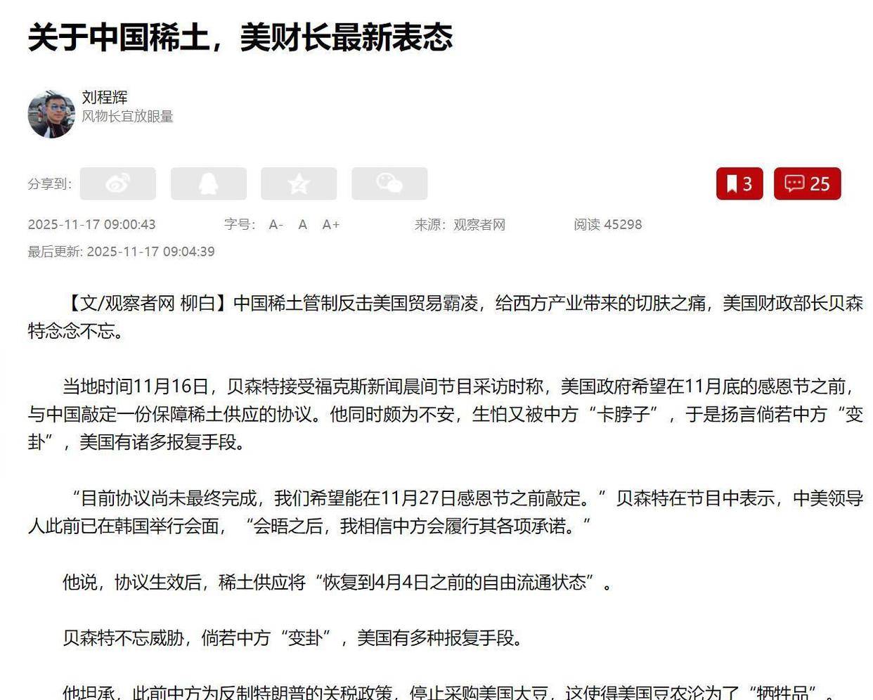 更讽刺的是,美财长贝森特在11月16日接受福克斯新闻采访时,一边声称“相信中方会履行承诺”,一边威胁“若中方变卦,美方有诸多报复手段”。